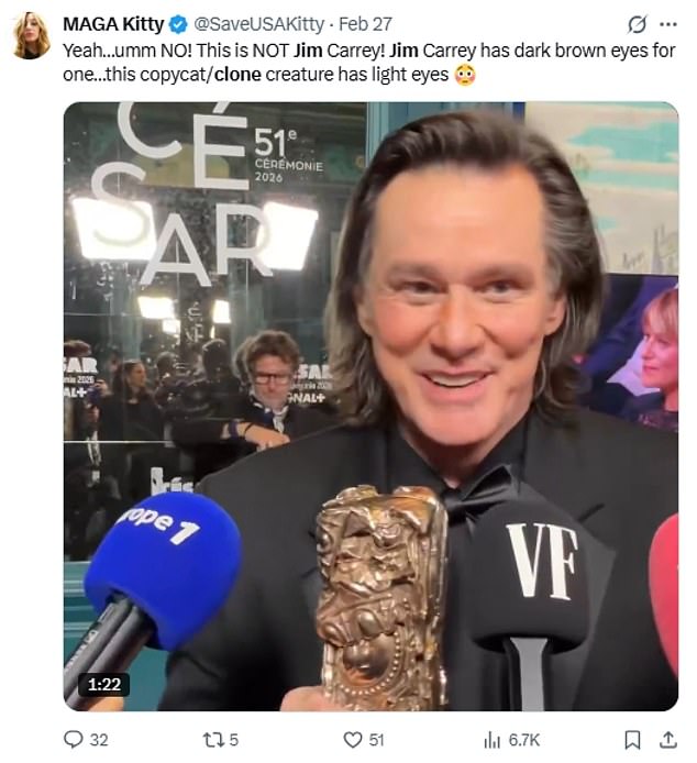 Muitos fãs também observaram que os olhos de Carrey parecem ter uma cor diferente, o que alimentou a ideia de que ele enviou um gêmeo ou alguém usando uma máscara realista ao evento.