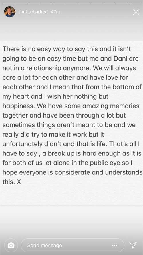 No entanto, o paranunciaram que iriam se separar para semprevoltando para abril de 2019, com Jack escrevendo: “Não há uma forma fácil de dizer isso e não será um momento fácil, mas eu e Dani já não estamos em um relacionamento mais.”
